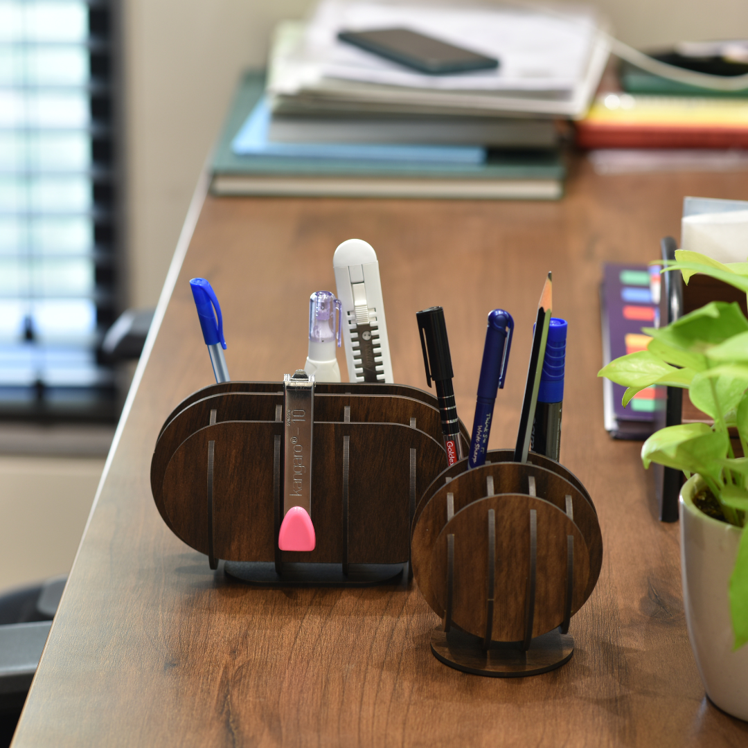 This beautifully crafted wooden pen stand features a unique spherical design with elegant curved slats, adding a modern and stylish touch to any desk. Made from high-quality wood with a rich dark brown finish, it offers spacious storage for pens, pencils, and stationery while the sturdy base ensures stability and desk protection. Compact yet functional, it’s perfect for home and office décor.